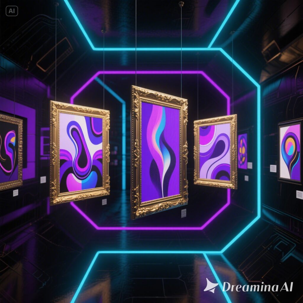 Design futurista e filosófico, com cores sombrias e neon (roxos profundos, pretos, dourados e azuis elétricos). No centro, uma galeria virtual com quadros flutuantes exibindo obras abstratas geradas por IA, inspiradas em Assim Falou Zaratustra.